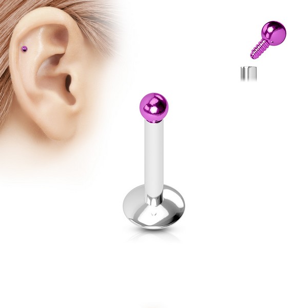 Лабрет с внутренней резьбой из хирургической стали 316L с анодированным шариком диаметром 2 мм.