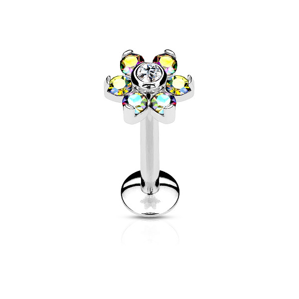 Лабрет с внутренней резьбой из хирургической стали 316L с накруткой в форме цветка диаметром 6 мм, украшенного кристаллами. В описании указан цвет центрального кристалла.