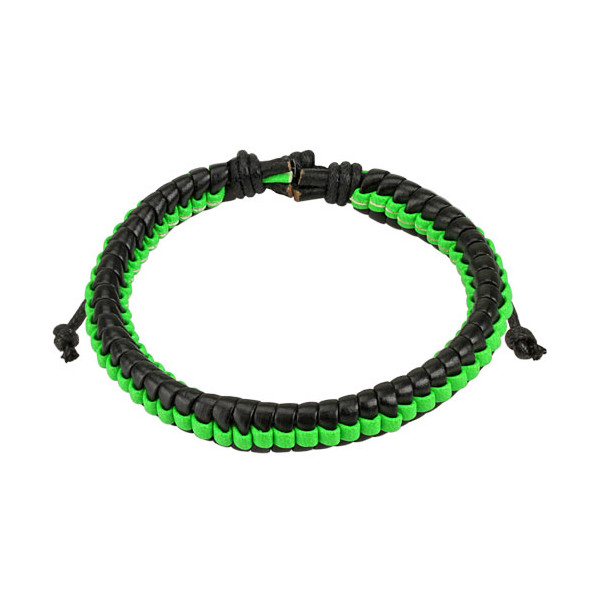 Браслет из туго переплетённых кожаных чёрных и ярко-зелёной полос.