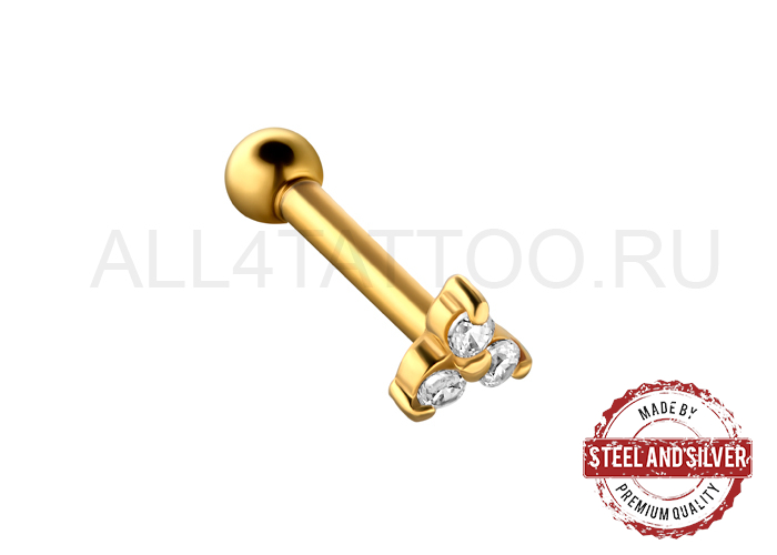 Микроштанга из хирургической стали 316L с 24х каратным золотым PVD покрытием. Украшена тремя фианитами, диаметр трилистника 3.5мм. Внутренняя резьба.