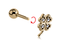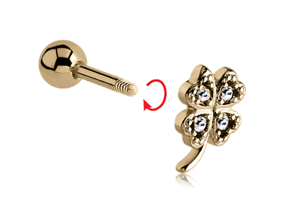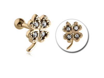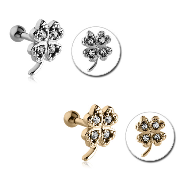 Микроштанга в виде клевера со стразами. Представлена в  двух вариациях: из полированной хирургической стали 316L  и с золотистым покрытием нитридом титана (Zircon gold).