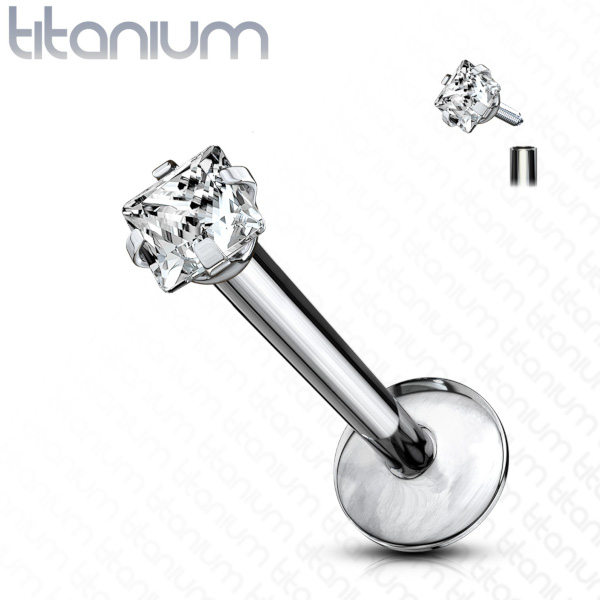 Лабрет из имплантационного титана 6Al-4V-Eli ASTM: F-136 с внутренней резьбой. Украшен крадратным кристаллом 2мм.