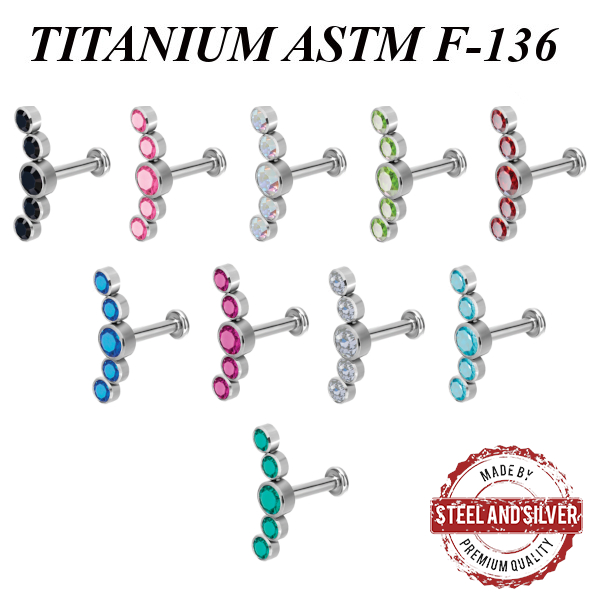 Лабрет из имплантационного титана 6Al-4V-Eli ASTM: F-136 с внутренней резьбой. Украшен кластером из пяти Premium Crystals.