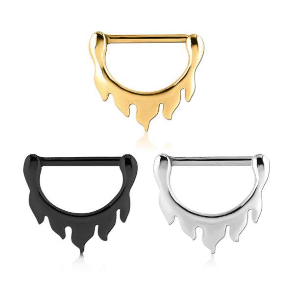Кликер для груди из хирургической стали 316L. Представлены три вариации: класичесский стальной, с золотым и чёрным PVD покрытием.