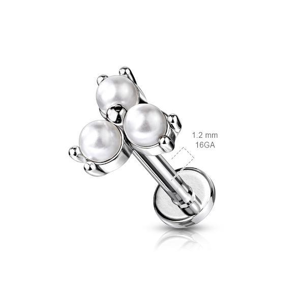 Лабрет из хирургической стали 316L с родированной латунной частью, украшенной тремя искусственными жемчужинами.