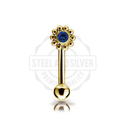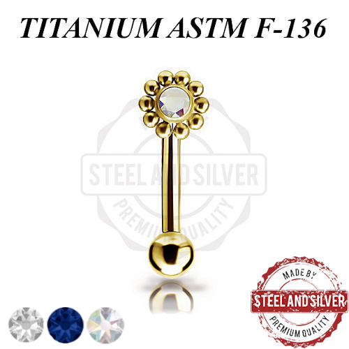 Микробанан с внутренней резьбой из имплантационного титана 6Al-4V-Eli ASTM: F-136 с PVD покрытием 24х каратного золота. Украшен кластером диаметром 4.5мм c Premium Zirconia.