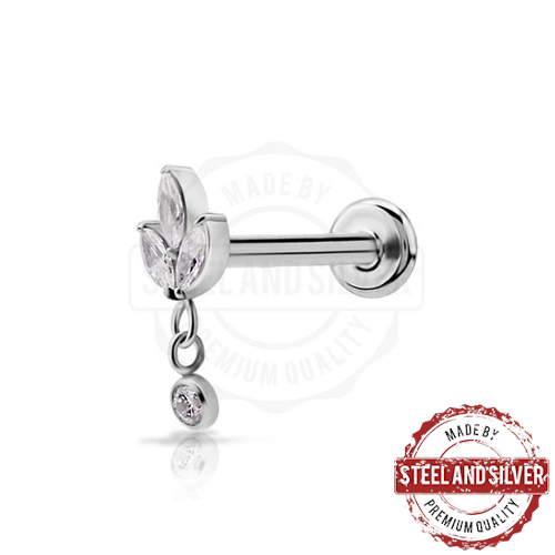 Лабрет с внутренней резьбой из хирургической стали 316L. Накрутка украшена кластером из кристаллов Premium Zirconia и дополнительным подвесным кристаллом. Размер декоративной части - 6х7мм, диаметр подвесного кристалла - 3мм.