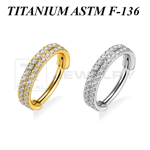 Кликер из имплантационного титана 6Al-4V-Eli ASTM: F-136 с двойным рядом миниатюрных прозрачных фианитов. Представлен в двух вариантах: классический титановый  и с золотым PVD покрытием.