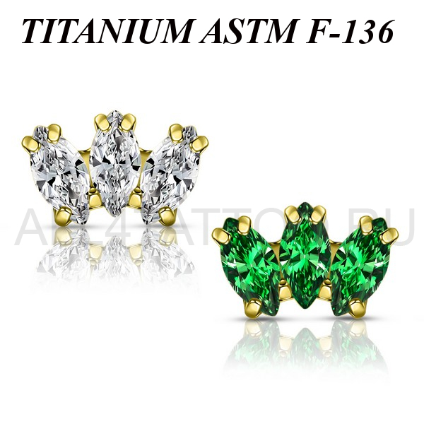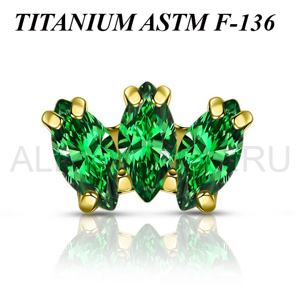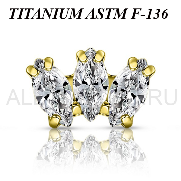 Накрутка из имплантационного титана 6Al-4V-Eli ASTM: F-136 с золотым PVD покрытием. Украшена тремя фианитами огранки "маркиз". Размер накрутки: 5,5х3мм. Подходит для украшений с внутренней резьбой толщиной 1 и 1,2 мм.