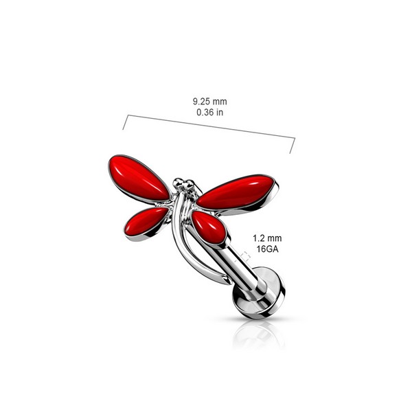 Лабрет с внутренней резьбой из хирургической стали 316L с накруткой в форме стрекозы из родированной латуни.