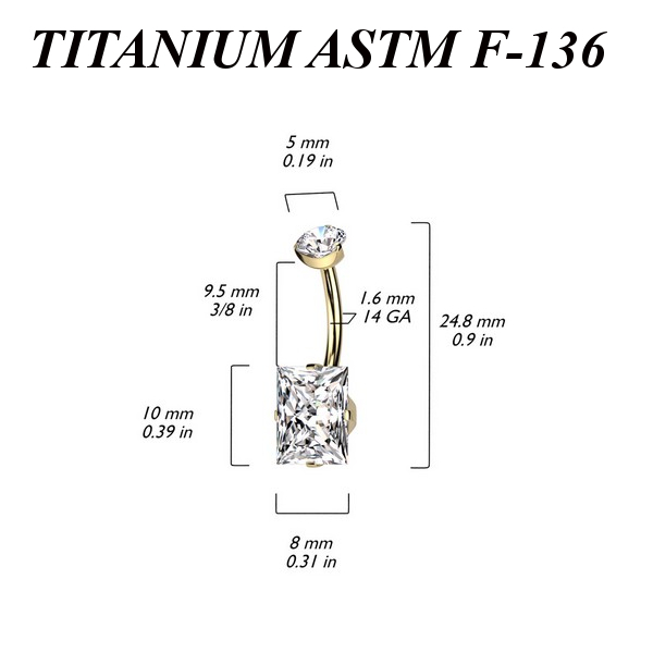 Банан с внутренней резьбой из имплантационного титана 6Al-4V-Eli ASTM: F-136 с золотым PVD покрытием. Украшен крупным прямоугольным кристаллом. Размер кристалла: 8х10мм.
