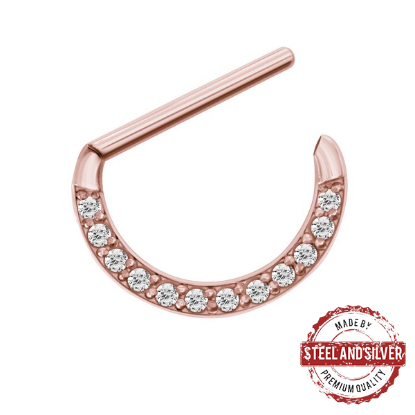 Кликер для груди из хирургической стали 316L с PVD покрытием розового золота. Украшен кристаллами Cubic Zirconia.