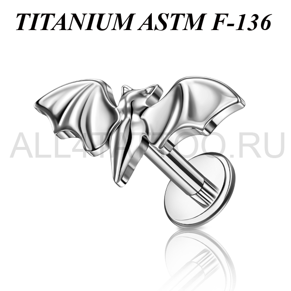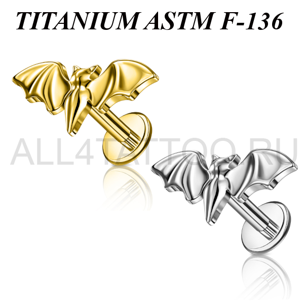 Лабрет с внутренней резьбой из имплантационного титана 6Al-4V-Eli ASTM: F-136 с накруткой в форме летучей мыши. Представлен в двух вариантах: классический титановый и с золотым PVD покрытием. Размер накрутки: 12х6мм.