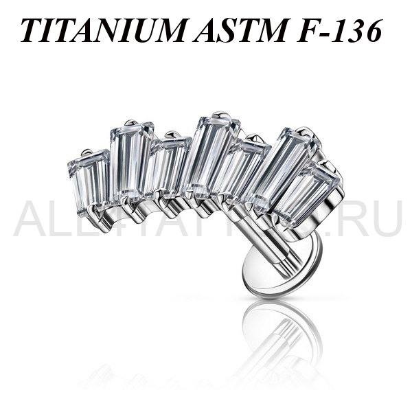 Лабрет из имплантационного титана 6Al-4V-Eli ASTM: F-136 с внутренней резьбой. Украшен кластером с прозрачными фианитами. Размер декоративной части: 13,5х5,5мм.
