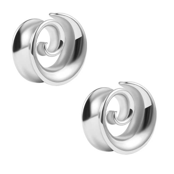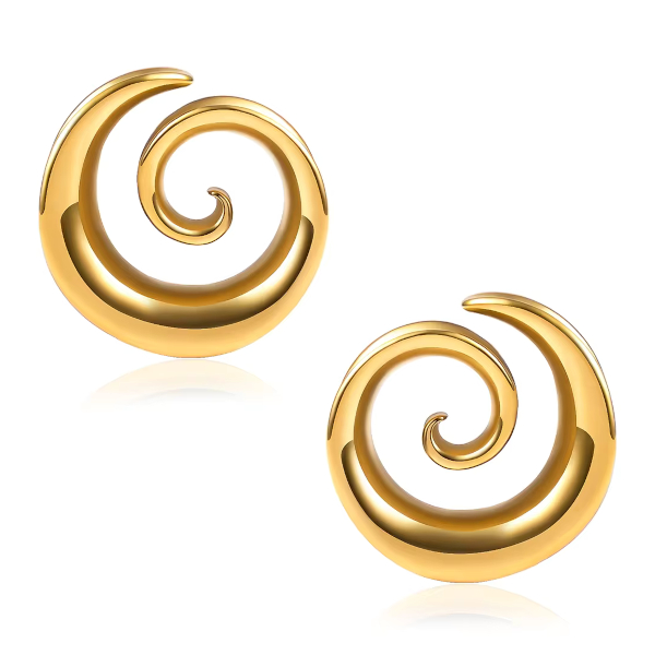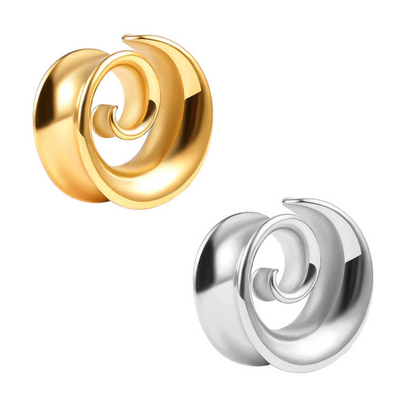 Тоннели с бортами из хирургической стали 316L в форме спирали. Представлены в двух вариантах: стальные и с золотым PVD покрытием. Ручная полировка.