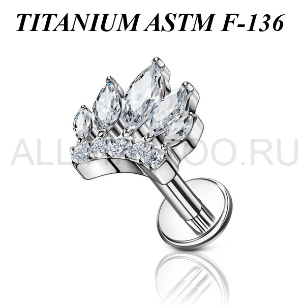 Роскошный лабрет с внутренней резьбой из имплантационного титана 6Al-4V-Eli ASTM: F-136. Украшен кластером с прозрачными фианитами.  Размер декоративной части: 7х6,7мм.