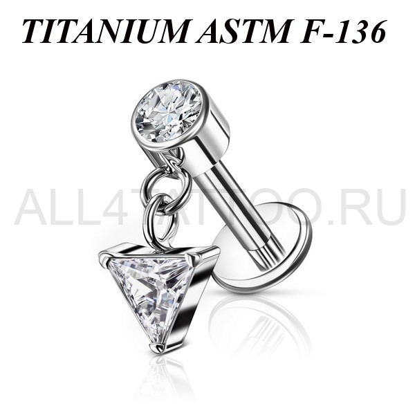 Лабрет из имплантационного титана 6Al-4V-Eli ASTM: F-136 с внутренней резьбой. Украшен накруткой с круглым фианитом и дополнительной подвеской с треугольным фианитом. Размер декоративной части: 4х9,6мм.