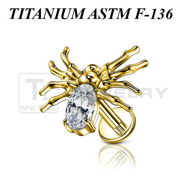 Лабрет с внутренней резьбой из имплантационного титана 6Al-4V-Eli ASTM: F-136 с фигурной накруткой в форме паука, украшенной прозрачным фианитом. Представлен в двух вариантах: классический титановый и с золотым PVD покрытием. Размер накрутки: 10х10,7мм.