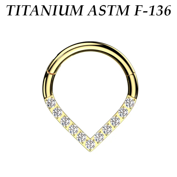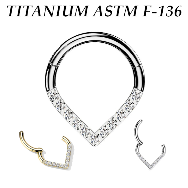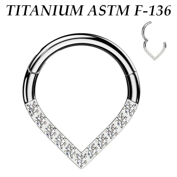 V-образный кликер из имплантационного титана 6Al-4V-Eli ASTM: F-136. Украшен сетом прозрачных фианитов.